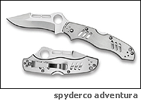 На это звание может смело претендовать разработка Spyderco под названием Adventura. Нож имеет совершенно вампирский вид, и как бы в насмешку, разработал его румын Alexandru Diaconescu. Просто зуб Дракулы какой-то, хорошо хоть серрейторный клинок пока не сделали:) В остальном система вполне традиционна, если такое слово можно употребить по отношению к изделиям Spyderco: рукоять из нержавейки на заклепках, большая спайдырка в клинке, реверсивный во все стороны клип.
