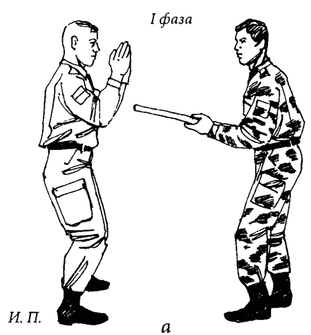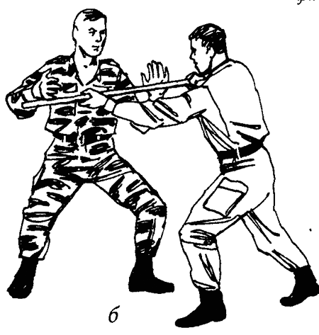 Ситуация: противник с выпадом наносит тычковый удар палкой в грудь (рис. 48а).
