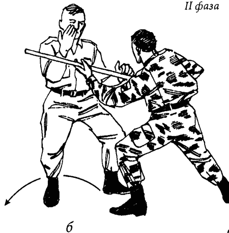 Благодаря предыдущим действиям защищающегося противник «провалился» и начал терять устойчивость, но имеет возможность ее восстановить, подшагнув правой ногой. Чтобы этого не случилось, защищающийся, применяя «пару сил» (левая рука на себя вниз — правая рука от себя вверх) и используя длинный рычаг, образовавшийся в результате захвата палки, отшагивает левой ногой, приседает и разворачивается, выводя проекцию центра тяжести противника за пределы опорной площадки (с точки зрения нападающего: вперед — вправо) (рис. 48в).