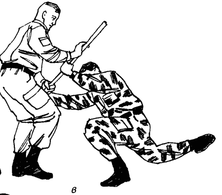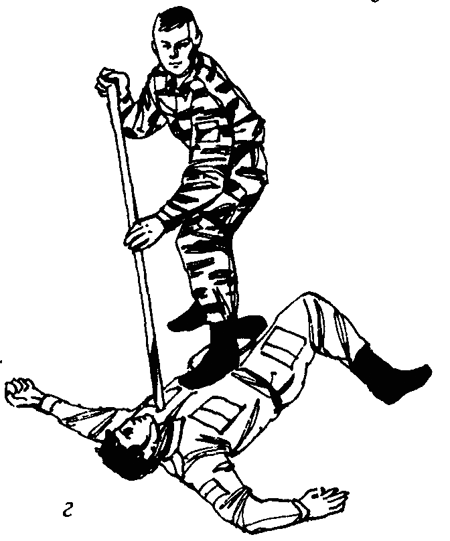 Так как дальний конец палки при этом заводится плавным движением вверх и за спину противника, возникает болевой рычаг на плечевой сустав атакующего. Под действием боли противник падает и выпускает палку (иначе будет вывих плечевого сустава) (рис. 49г).
