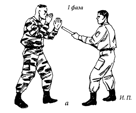 Ситуация: противник наносит косой удар палкой сверху справа налево (рис. 50а).