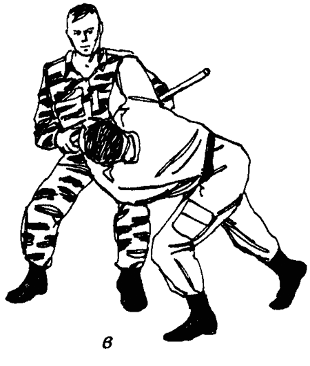 Далее правая рука защищающегося продолжает движение палки и рук противника, обеспечивая скручивание его корпуса, а как следствие — выведение его центра тяжести за пределы опорной площадки. Левая рука производит захват за волосы, одновременно защищающийся наступает правой ногой на подколенный сгиб ближней к себе ноги противника (рис. 50г). За счет кругового движения левой рукой на себя вниз, а правой от себя вверх и одновременного приседа обеспечивается опрокидывание противника (рис. 50д). Механизм см. стр. 93-97, рис. 4.