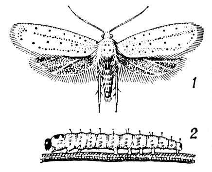 Яблонная моль: 1 — бабочка; 2 — гусеница.