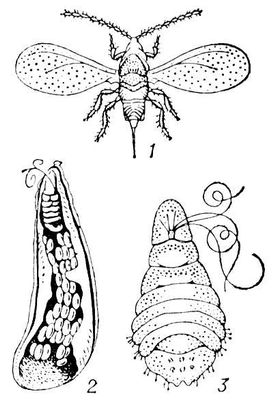 Яблонная запятовидная щитовка: 1 — самец; 2 — щиток самки снизу (видно тело самки и отложенные ею яйца); 3 — самка, извлечённая из-под щитка.