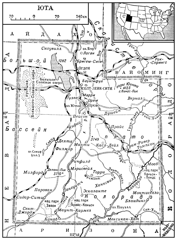 Ю'та (Utah), штат на горном Западе США. Площадь 220 тыс. км2 . Население 1,2 млн. человек (1976), в том числе городское 82%. Административный и хозяйственный центр — Солт-Лейк-Сити. Большую часть территории Ю. занимают пустынные плоскогорья (Большой Бассейн, плато Колорадо и др.), пересечённые горными хребтами (Уосач, Юинта) высотой до 4123 м и глубокими речными ущельями; на В. — отроги Скалистых гор. Средняя температура января от —2 до —4 °С, июля 17—20 °С. Осадков 250—400 мм в год. Главная река — Колорадо с притоками, на С.-З. — бессточные бассейны с озёрами (крупнейшее — Б. Солёное озеро). Растительность преимущественно полупустынная и пустынная. Население сконцентрировано в оазисах. Экономически активного населения 470 тыс. (1975), в том числе занятых в сельском хозяйстве 14 тыс., в горнодобывающей промышленности 14 тыс., в обрабатывающей промышленности 72 тыс., на транспорте 28 тыс. Около 75% с.-х. продукции даёт животноводство; преобладает пастбищное отгонное скотоводство. На орошаемых землях (0,6 млн. га ) выращивают сахарную свёклу, люцерну, овощи. Добывают нефть (5,5 млн. т в 1976), природный газ, каменный уголь, медь (2-е место в США), полиметаллы, золото, железную и урановую руду. Ведущие отрасли обрабатывающей промышленности: цветная (главным образом в районе Солт-Лейк-Сити) и чёрная (Прово-Дженива) металлургия, нефтеперерабатывающая, химическая, пищевая (мясная, сахарная), радиоэлектронная промышленность, производство ракет, с.-х. орудий.