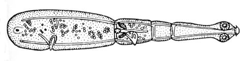 Эхиноко'кк (Echinococcus granulosus), ленточный червь, во взрослом состоянии паразитирующий в кишечнике собаки, волка, шакала, реже кошки. Тело длиной 3—5 мм , состоит из головки (с 4 присосками и 2 венчиками крючьев) и 3—4 члеников. Последний (единств, зрелый) членик составляет половину длины тела. Яйца Э. выходят из кишечника хозяина вместе с экскрементами и могут попасть на его шерсть. Промежуточный хозяин Э. — корова, овца, свинья и др. Животные, а также человек — заражается, заглатывая яйца Э. В кишечнике промежуточного хозяина из яйца выходит личинка — онкосфера . Через стенку кишечника она проникает в систему воротной вены и с кровью заносится в печень, реже в лёгкие, мышцы, кости и другие органы. Здесь она развивается в пузырчатую стадию, которая также называется Э. Каждая онкосфера образует пузырь, на стенках его возникают вторичные и даже третичные пузыри, на которых формируется множество головок, сходных с таковыми взрослых червей. Пузыри Э. растут очень медленно и могут достигать больших размеров. Окончательный хозяин заражается Э. при поедании больного или павшего животного, содержащего пузырчатую стадию этого червя. Разнообразие строения пузырчатых стадий Е. granulosus наводит на мысль о существовании двух самостоятельных видов — Е. unilocularis (однокамерный Э.) и Е. multilocularis (многокамерный Э.). Последний иногда выделяется в самостоятельный род — Alveococcus. См. Эхинококкоз .