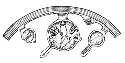 Разрез через часть эхинококкового пузыря, содержащего дочерние пузыри с зачатками головок.