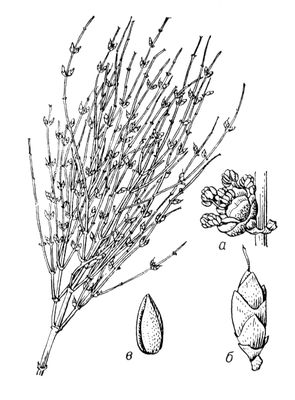 Эфедра хвощевая, ветвь цветущего пестичного растения; а — тычиночный колосок (собрание микростробилов); б — семезачаток со стерильными кроющими чешуями; в — семя.