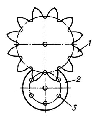 Це'вочный механи'зм, зубчатый механизм для передачи вращения между параллельными валами, в котором одно из колёс, называемое цевочным, имеет зубья, выполненные в виде круговых цилиндров — цевок 3 (см. рис. ). Зубья колеса 1 , сопряжённого с цевочным 2, выполнены по эквидистанте (равноотстоящей кривой) к эпи- или гипоциклоиде (см. Линия ). Преимущество Ц. м. перед др. видами зубчатых механизмов в том, что цевки можно сделать вращающимися относительно своих осей. При этом уменьшаются потери на Tpenpie в зубчатом зацеплении и снижается износ поверхностей зубьев. Цевочное зацепление является частным случаем циклоидного зацепления . На рис . изображен Ц. м. с внешним зацеплением, при котором цевочное колесо 2 и зубчатое колесо 1 вращаются в противоположных направлениях. Цевки в этом случае располагаются на начальной окружности цевочного колеса 2 (см. Зубчатая передача ). При внутреннем зацеплении цевочное и зубчатое колёса вращаются в одном н том же направлении. Цевки располагаются на окружности, радиус которой больше радиуса начальной окружности. Ц. м. с внутренним зацеплением даёт возможность получить разность между числом цевок и числом зубьев, равную единице, что обеспечивает большое передаточное число в планетарном редукторе (до 1: 100 в одной ступени) при относительно высоком кпд (около 0,75) и компактности передачи. Ц. м. применяется преимущественно в планетарных редукторах и приборах.