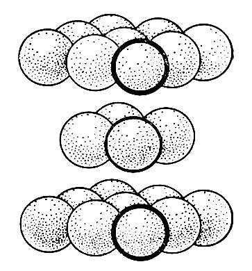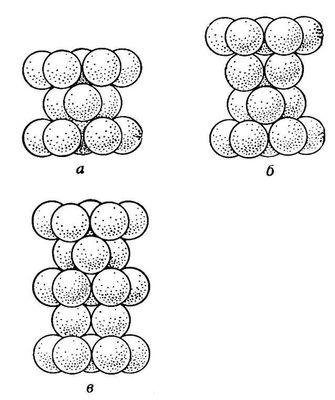 Очевидно, что шары третьего слоя будут лежать точно над шарами первого. Такая упаковка обычно называется кубической плотнейшей гранецентрированной. Она считалась единственной, пока в 1900 англ. кристаллограф У. Барлоу не показал, что, поставив куб на угол, его можно разобрать на плоские ещё более плотные слои (рис. 3 ), в которых лунок между шарами в два раза больше числа самих шаров (рис. 4 ). Варьируя укладку плотноупакованных слоев (рис. 5 ), получают бесчисленное множество плотнейщих упаковок с одинаковым коэффициентом заполнения – 74,05%. Если ограничить наслаивание некоторым периодом, то получается: двухслойная плотнейшая упаковка (рис. 6 , а, третий слой повторяет первый), трёхслойная (рис. 6 , б, четвёртый слой повторяет первый), четырёхслойная (рис. 6 , в) и т.д. Трёхслойная упаковка – это исходная кубическая, прочие – все гексагональные.