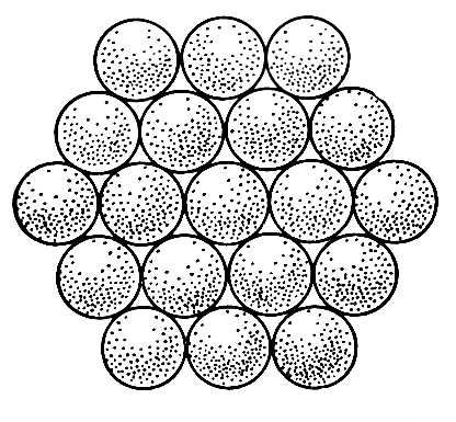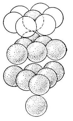Более 300 лет известна (И. Кеплер) и признаётся наиболее плотной упаковка шаров «вручную» (рис. 1 ), когда на слой шаров, уложенных с квадратным мотивом, наложен другой такой же слой шаров в лунки нижележащего (коэффициент заполнения пространства 74,05%, рис. 2 ).