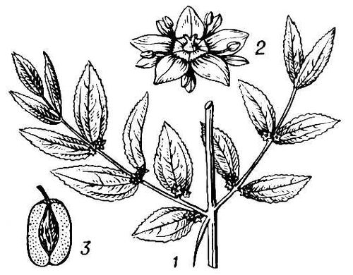 Унаби: 1 — ветка с цветками; 2 — цветок; 3 — продольный разрез плода.