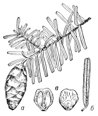 Тсуга канадская: а — ветвь с женской шишкой; б — лист; в — семенная чешуя с внутренней (с двумя семенами) и внешней стороны.