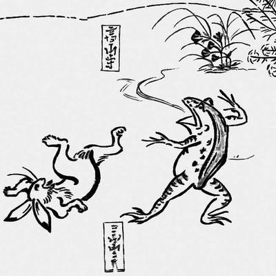 Тоба Содзё (?). «Лягушка, швыряющая зайца». Деталь «Свитков с карикатурами на животных». Тушь, бумага. Монастырь Козандзи близ Киото.