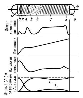 Внешний вид и распределение параметров в нормальном тлеющем разряде при относительно низком давлении: 1 — катод; 2 — астоново тёмное пространство; 3 — астоново свечение (катодная плёнка, катодный слой); 4 — катодное тёмное пространство; 5 — катодное (отрицательное, тлеющее) свечение; 6 — фарадеево тёмное пространство; 7 — положительный столб; 8 — анодная область; 9 — анод.