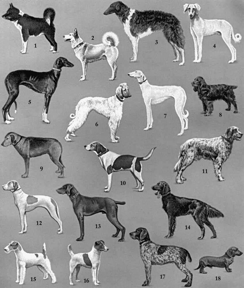 Охотничьи собаки: 1. — Русско-европейская (русская) лайка. 2. — Западно-сибирская лайка. 3. — Русская псовая борзая. 4. — Среднеазиатская борзая (тазы). 5. — Хортая борзая. 6. — Афганская борзая. 7. — Южнорусская степная борзая. 8. — Спаниель. 9. — Русская гончая. 10. — Русская пегая гончая. 11. — Английский сеттер. 12. — Пойнтер. 13. — Короткошёрстная немецкая легавая. 14. — Ирландский сеттер. 15. — Жесткошерстный фокстерьер. 16. — Гладкошёрстный фокстерьер. 17. — Жесткошёрстная немецкая легавая. 18. — Такса.