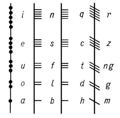 Лит.: Ferguson S., Ogham inscriptions in Ireland, Wales and Scotland, Edinburgh, 1887; Macalister R. A. S., Studies in Irish epigraphy, v. 1—3, L., 1897—1907; Vendryes J., L’écriture ogamique et ses origines, «Études celtiques», 1939, v. 4.