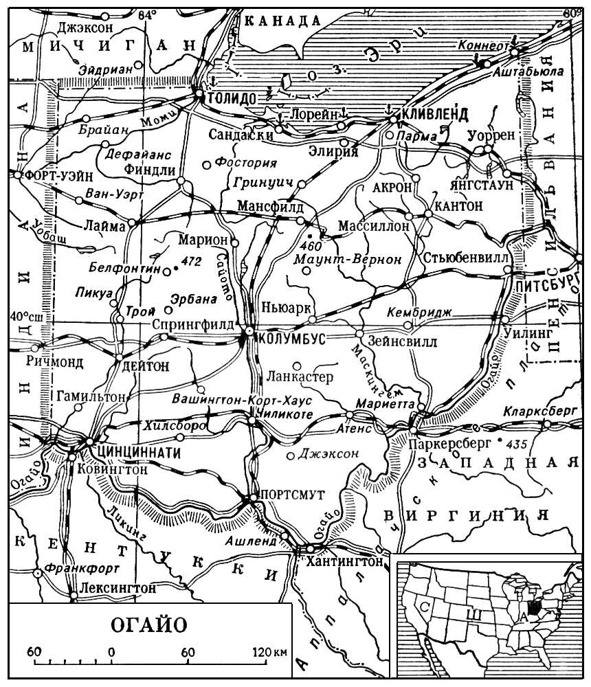 Ога'йо (Ohio), штат на С.-В. США. Площадь 106,76 тыс. км2. Население 10,7 млн. чел.(1970), в том числе городского 75,3%. Административный центр — г. Колумбус; главные экономические центры — Кливленд и Цинциннати. На В. — Аппалачское плато (высота до 460 м), на З. постепенно переходящее в волнистые Центральные равнины. Средние температуры января от 0 до —3 °С, июля 23—25 °С; осадков 800—1000 мм в год. На Ю. — крупная судоходная р. Огайо, на С. — озеро Эри. На плато местами сохранились широколиственные леса.