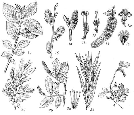 Разные виды ив. Ива козья: 1а — ветка с листьями; 1б — ветка с мужскими сережками; 1в — женская сережка; 1г — мужской цветок; 1д — женский цветок; 1е — сережка с раскрывшимися плодами; 1ж — раскрывшаяся коробочка; 1з — семя. Ива пятитычинковая: 2а — ветка с листьями и мужскими сережками; 2б — ветка с листьями и женскими сережками; 2в — мужской цветок. Ива прутьевидная: 3а — ветка с листьями. 4 — Ива трявянистая.