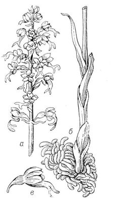 Гнездовка настоящая: а — соцветие; б — стебель с корневищем; в — цветок.