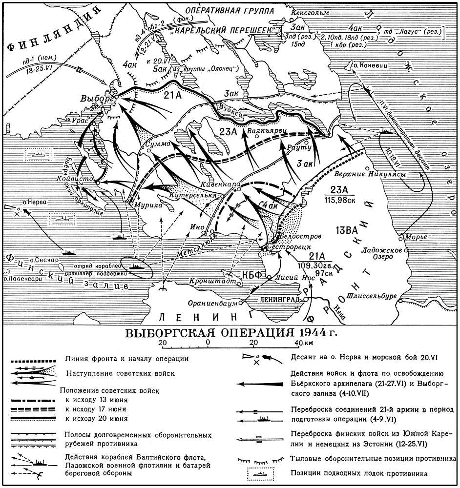Вы'боргская опера'ция 1944, одна из завершающих операций битвы за Ленинград (см. Ленинградская битва 1941—44 ) в период Великой Отечественной войны 1941—45; составная часть стратегической операции на северо-западном направлении в июне — августе 1944 с целью вывода из войны Финляндии. В. о. осуществляли войска правого крыла Ленинградского фронта (Маршал Советского Союза Л. А. Говоров) во взаимодействии с Балтийским флотом (адмирал В. Ф. Трибуц) и Ладожской военной флотилией (контр-адмирал В. С. Чероков) в период 10—20 июня. Боевые действия в В. о. происходили на труднодоступной лесисто-болотисто-озёрной местности Карельского перешейка. Долговременная глубоко эшелонированная оборона Карельского укреплённого района была насыщена железобетонными и дерево-земляными сооружениями, мощными заграждениями и препятствиями. Замысел В. о. предусматривал нанесение главного удара в направлении Белоостров, Выборг. К началу В. о. общее соотношение в силах было в пользу советских войск — по пехоте в 2 раза, по артиллерии и танкам почти в 6 раз, по авиации в 3 раза. Накануне операции 9 июня в течение 10 ч происходило предварительное разрушение важных оборонительных сооружений огнём 240 орудий калибра 122—406 мм и ударами авиации. 10 июня после мощной артиллерийской и авиационной подготовки пехота и танки атаковали вражеские позиции. В ходе 4-дневных боёв соединения 21-й и часть сил 23-й армий прорвали первую полосу обороны противника; попытка прорвать с ходу вторую полосу в районе Кивеннапы успеха не имела. Тогда командующий фронтом осуществил искусный манёвр и перенёс основные усилия войск в район приморского шоссе. Несмотря на бездорожье, на новое направление было скрытно перегруппировано до 110 артиллерийских дивизионов, в результате чего плотность на участке прорыва достигла 200 орудий и миномётов на 1 км . 14 июня советские войска начали штурм второй наиболее мощной полосы обороны. Массированный удар авиации по важному узлу обороны Кутерселькя и успешный обходный манёвр 1-й гвардейской танковой бригады предрешили успех прорыва второй полосы к исходу 15 июня. 17 июня советские войска подошли к третьей полосе обороны противника, который попытался приостановить здесь наступление советских войск. Советское командование вводом в бой резервов и согласованными действиями сухопутных войск, флота и авиации сорвало замысел противника. Третья полоса была прорвана, и 20 июня советские войска штурмом овладели Выборгом. В ходе В. о. впервые в военной истории был в короткий срок прорван современный укреплённый район со средним темпом продвижения 10—12 км в сутки. Противник был вынужден перебросить на выборгское направление свыше 5 дивизий, серьёзно ослабив группировку своих войск перед Карельским фронтом, что создало условия для проведения Свирско-Петрозаводской операции 1944 .