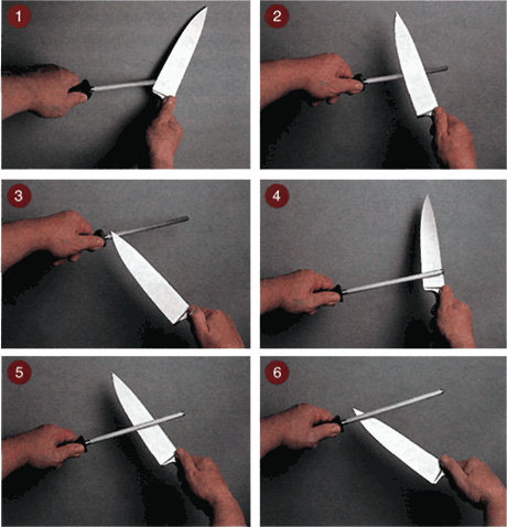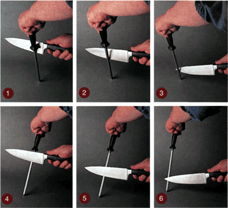 Самый распространенный способ правки ножа у профессионалов. Движения производятся последовательно, начиная с пятки клинка, плавно вдоль тела мусата и заканчивается сходом клинка у гарды (фото 1, 2, 3). На фото 4, 5, 6 показана последовательность движений при правке противоположной (левой)стороны клинка.