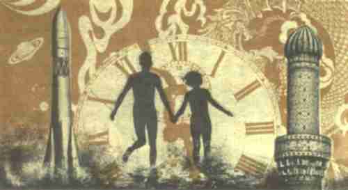 Они пробежали по длинному коридору и вдруг оказались в большом зале с ребристыми колоннами. Сквозь стеклянную крышу били солнечные лучи, переливаясь в грудах монет. Все помещение заполняло золотое сияние, в воздухе дрожали золотые пылинки. Там и сям лежали кувшины, истекающие дирхемами и динарами. В волнах золотого моря плавал распахнутый сундук, наполненный лалами, яхонтами и гранатами.