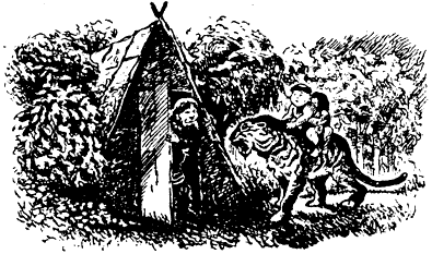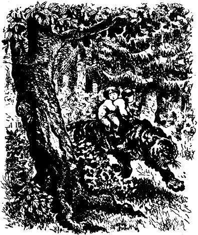 Через спину перекатился, тигром стал. Детей на спину посадил, в тигриное стойбище унёс. Говорит своим сородичам: