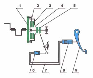 СЦЕПЛЕНИЕ (рис. 3) обеспечивает передачу крутящего момента посредством силы трения от двигателя на ведущие колеса, служит для кратковременного разъединения двигателя от ведущих колес и плавного их соединения.