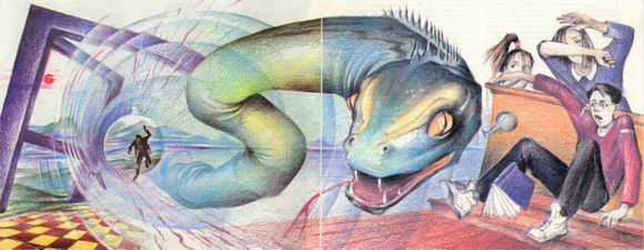 Было видно, что учитель физики изнемогает. В класс ломился кто-то большой и сильный. В конце концов, Лаэрт Анатольевич отлетел в сторону, и в распахнувшихся створках показалась голова, похожая на змеиную, но увеличенную в несколько раз, с двумя горящими голубыми глазами. У головы равномерно из стороны в сторону, как жернова, двигались челюсти, словно они перетирали какой-то твердый предмет. Мельком оглядев оцепеневший седьмой "А", голова, покачиваясь на длинной шее, которая стала вытягиваться из коридора, двинулась над столами вслед за пятившимся по проходу смертельно бледным Лаэртом Анатольевичем. Вера Владимировна без сил опустилась на стул; кажется, она была в глубоком обмороке. Девчонки подняли отчаянный визг. Увлекающаяся биологией отличница Букина, у которой были очень крепкие нервы, машинально определила: