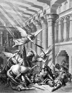 25 ибо явился им конь со страшным всадником, покрытый прекрасным покровом: быстро несясь, он поразил Илиодора передними копытами, а сидевший на нем, казалось, имел золотое всеоружие.