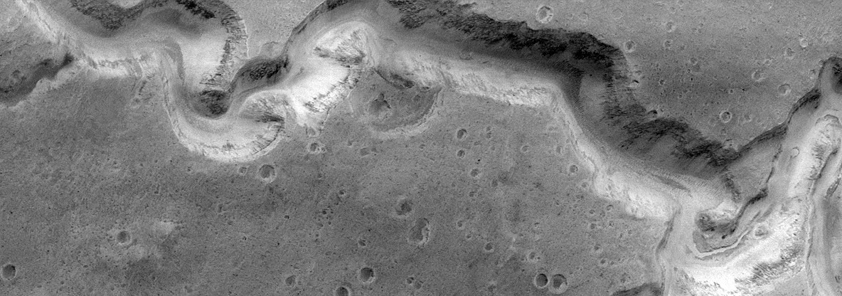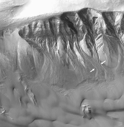 Наряду с осыпями сыпучего материала на рис. 2 можно видеть тонкие нитевидные километровые овраги или борозды, спускающиеся по склону (показаны стрелками). Овраги и их притоки очень похожи на промоины земных горных рек или ручьёв, и образованы, как предполагается, потоками воды. Однако они имеют необычный вид, противоположный ходу земных склоновых рек: они широки вверху склона, затем сужаются, заканчиваются тонким ручьем и исчезают на дне долины или кратера. Кажется, что они направлены вверх по склону. (Кстати, поэтому они не могли возникнуть под действием камнепада или крупномасштабного селя. Тем более они не могли образоваться под действием пылевых оползней, которые засыпают все овраги). Их ширина и глубина в узкой части близка к 10–20 м, а протяженность составляет от нескольких сотен метров до нескольких километров.