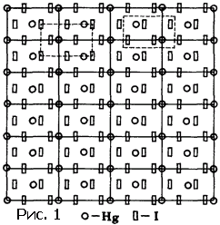 На рисунке 1 изображена атомная структура кристалла йодистой ртути. Молекула этого вещества состоит из одного атома ртути и двух атомов йода. Атомы, образующие кристалл, расположены так, как детали рисунка обоев. Если раскрасить фигурки, соответствующие атомам разных сортов, в разные цвета, то получатся обои. Может быть, с эстетической точки зрения они оставят желать лучшего, но принцип обоев будет налицо: можно выделить элементарную ячейку, периодическим смещением которой в двух направлениях «строятся» обои. Про обои можно сказать, что они представляют двумерную решетку. Удалите мысленно все детали рисунка, кроме линий, и справедливость предыдущей фразы станет очевидной. Точки пересечения линий называют узлами.