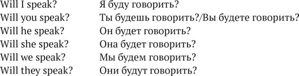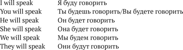 И в отрицательной форме всё одинаково. Won’t – это will not, можно говорить и так, например I will not speak, You will not speak и так далее.