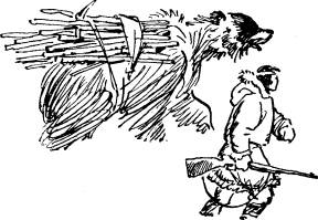 Следующая западня не была похожа ни на одну из виденных им до сих пор. Это была прочная клетка из свежих, крепко перевязанных между собой осиновых кольев. Над входом в клетку торчало толстое бревно, опиравшееся на крепкую ветку с рогатиной на конце. К этой же ветке была прилажена длинная жердь, уходившая далеко в глубь клетки… На конце жерди висела заячья тушка. Наполовину освежёванный заяц выглядел очень аппетитно. Пробегавшие мимо рыси и дикие кошки должны были сразу видеть, что их ждёт прекрасный обед — нужно только сделать несколько шагов и сорвать зайца с жерди.