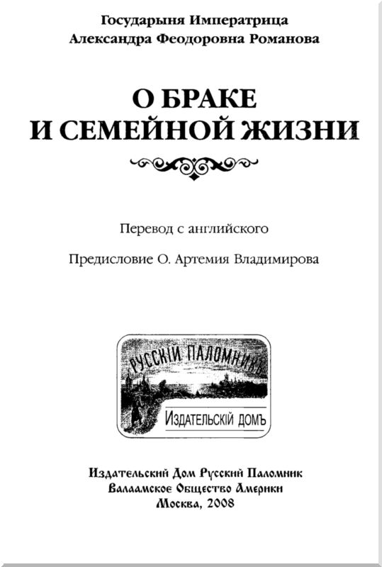 Для меня эти выдержки из записей Императрицы Александры Феодоровны явились подлинным откровением. Насколько много ныне встречается духовных сочинений, посвященных монашеству, настолько скуден перечень книг, которые знакомили бы современного читателя с христианским осмыслением супружества. А между тем большинство христиан избирают путь венчанного брака, именуемого святыми Отцами «пристанью целомудрия».