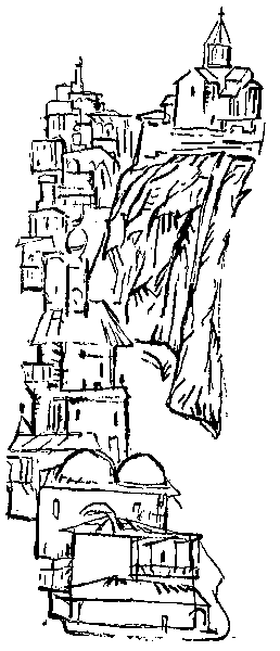 В крцанисских, сейдабадских и гареубанских садах деревья словно окутались бело-розовой дымкой. Раскрывались почки, и нежные листики трепетали под дуновением ветерка. Зашумел и приглохший зимой город. В каждом уголке, на плоских крышах домов, поднимавшихся в гору и похожих на высокие ступени, в узких переулках, на папертях храмов и у серных бань слышался оживлённый говор горожан. Одни выбивали ковры, другие раздували мангалы, третьи подметали дворы. Оживлению города радовались и воробьи, задорно чирикавшие на пыльных площадях; они стайками рылись в навозе и при появлении прохожего с шумом пороховой вспышки взметались к небу.