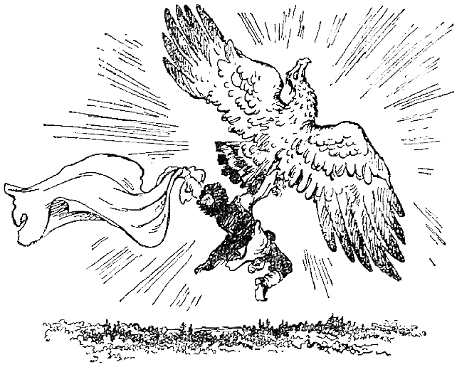 Немного времени прошло — вылетел из леса огромный огненный орёл, покружил над полем и опустился прямо на грудь Тимура. Тут Тимур быстро схватил орла за ногу.