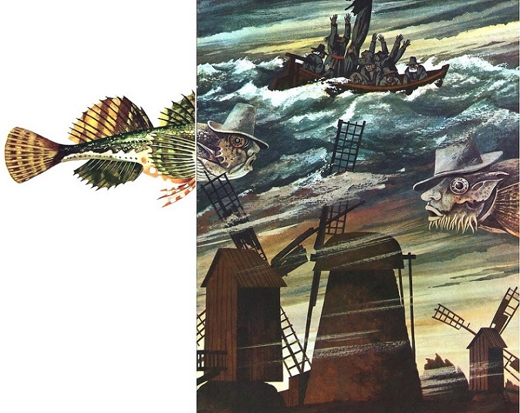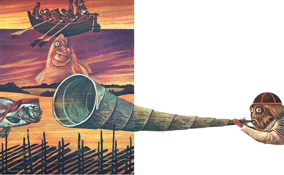 И снова заиграл рожок и тоненько зазвенели колокольчики. А в лодке вдруг зашевелилась рыба. С самого дна, извиваясь, выползла удивительная щука, раскрыла свой зубастый рот и захлопала жабрами.