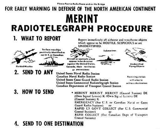 Июль 1959 года. Штаб ВМС США издает Инструкцию "OPNAV...-94-р-З", согласно которой капитанам торговых и рыболовецких судов предписывалось, также как и военным, передавать немедленные донесения по радио с кодовой группой букв "MERINT" о приближении к Американскому континенту неизвестных ракет, НЛО, кораблей, подводных лодок и самолетов. В приложении к Инструкции помещены изображения дискообразного и продолговатого НЛО. Для ускорения опознавания НЛО на большинстве американских военных кораблей помещены изображения основных типов НЛО. В справочнике американских ПВО также помещено изображение НЛО в форме диска с огнями.
