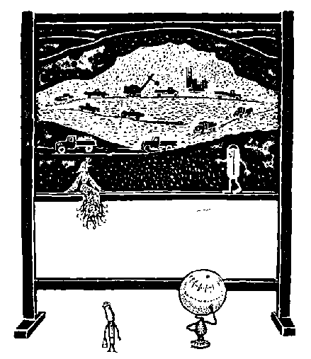 Не успел Мелок допеть свою песенку, как на доске появилась целая картина: холмистая степь, овраги, дорога, на которой стояли тяжело нагруженные самосвалы. Вдали виднелся какой-то большой холм с совершенно белым склоном.