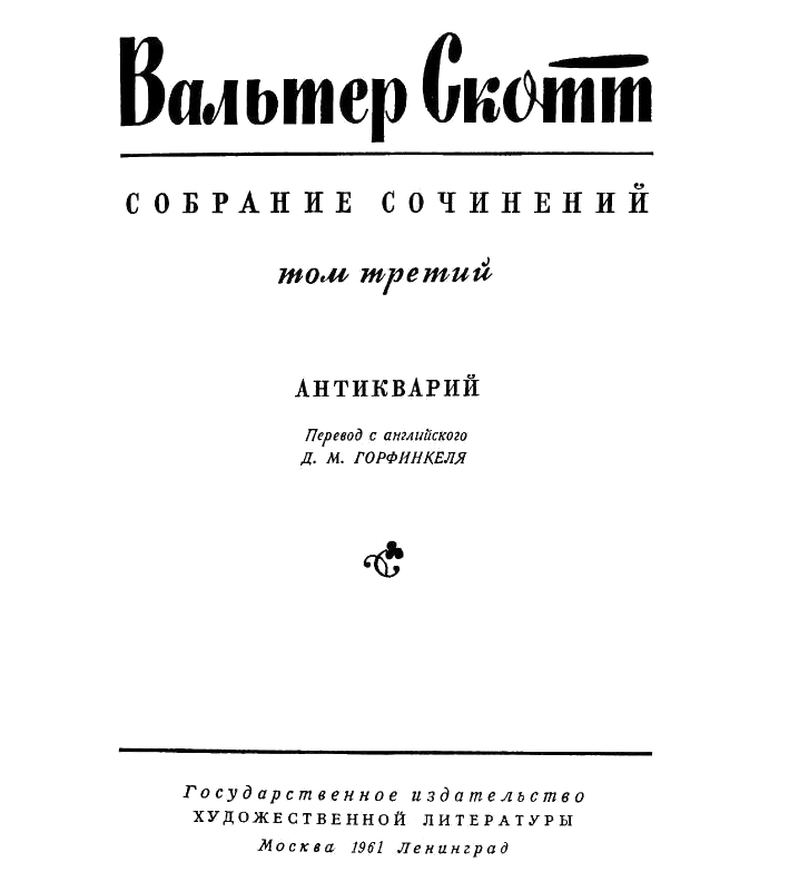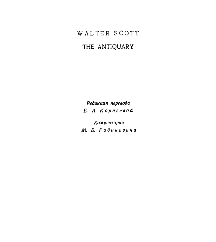 Настоящей книгой завершается серия повествований, задуманных с целью описать шотландские нравы трех различных периодов: «Уэверли» охватывает эпоху наших отцов, «Гай Мэннеринг» — время нашей юности, «Антикварий» же относится к последнему десятилетию восемнадцатого века. Я стремился — особенно в двух последних произведениях — искать прообразы главных действующих лиц в той части общества, которая менее всего поддается воздействию всеобщей взаимной полировки, постепенно сглаживающей различия в нравах разных наций. С той же средой я связал и многие сцены, в которых старался изобразить игру страстей более высоких и бурных, потому что люди низших классов меньше привыкли подавлять свои чувства и потому что — в этом я вполне согласен с моим другом Вордсвортом — они редко упускают случай выразить их сочным и чрезвычайно сильным языком. Этим, по моему мнению, отличаются жители сельских местностей моей родины, представители среды, с которой я давно и близко знаком. Античная сила и простота их языка, часто уснащенная восточным красноречием Священного писания в устах наиболее развитых из них, придают пафос их горю и достоинство их негодованию.