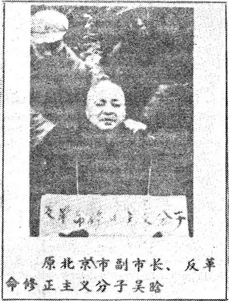 На табличке надпись: «Контрреволюционер, ревизионист». Текст под фотографией: «Бывший заместитель мэра Пекина контрреволюционер, ревизионист У Хань». Снимок из китайской печати времён «культурной революции».