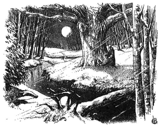 Лишь только человек встал, сквозь недвижный воздух неожиданно пробился перезвон колоколов. Это церковь в деревне сзывала народ на Рождественскую полуночную службу. Для Брока то было зловещее предзнаменование. Полночные Колокола раздавались раз в году, и двумя днями позже приходили убийцы. Лес нужно предупредить! Он обернулся к странной картине под дубом и увидел, что двое стоят на коленях у свертка. Тот, что с длинными волосами, приблизил голову к незакрытому промежутку, помедлил секунду-две и отодвинулся. Потом оба встали с коленей и на мгновение обхватили друг друга руками — такого Брок ранее за уркку не замечал. Он почувствовал исходящее от них глубокое чувство нежности и печали, и его самого начало пощипывать от волнения и предчувствий, пока он глядел, как они медленно, рука в руке, идут прочь оставив сверток под Большим Дубом.