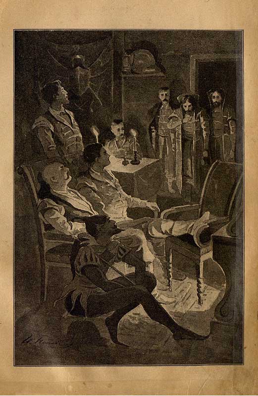Так, разговаривая, они дошли до лагеря, освещенного целым рядом костров, и между воинских палаток, землянок и бараков, сколоченных из обгорелых досок и бревен, направились к главной квартире. То был загородный хутор, который один лишь во всей окружности уцелел каким-то чудом среди общего разрушения. Чудо совершил все тот же маленький царский секретарь: благодаря его предусмотрительности, хутор с первого же дня осады Новгород-Северска был окружен охранной стражей, а теперь в нем помещались не только царевич и гетман (каждый на своей половине), но и войсковая канцелярия, а также все региментари (полковые командиры); эти, впрочем, — в надворных постройках.