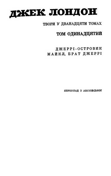 Поки містер Гегін не схопив його раптом під пахву й не ступив у корму вельбота, який дожидав біля берега, Джеррі й гадки не мав, що з ним скоїться щось лихе. Містер Гегін був хазяїн Джеррі, укоханий хазяїн усі шість місяців, скільки Джеррі жив на світі. Джеррі не знав, що містер Гегін — це «хазяїн», бо такого слова не було в словнику золотаво-рудого ірландського тер’єра з гладенькою шерстю. Однак для Джеррі слова «містер Гегін» означали якраз те, що розуміють люди під словом «хазяїн», коли йдеться про їхні стосунки до своїх собак. Джеррі чув, що цими двома словами завжди звертаються до його хазяїна клерк Боб і Дербі, наглядач на плантації. І так само завжди зверталися до нього ті двоногі істоти людської породи, що вряди-годи, як оце на «Еренджі», навідували Меріндж.