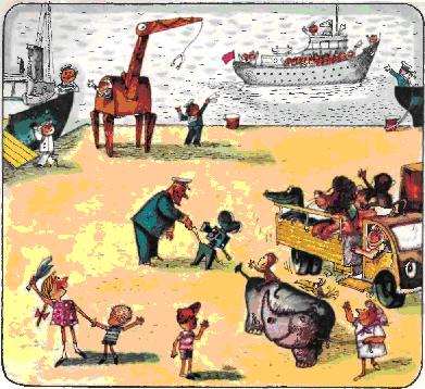 Крану было очень стыдно за свой промах. Он начал торопливо выгружать следующего зверя — бегемота. Наверное, от большой спешки так и получилось — кран впопыхах опустил бегемота не на берег, а на палубу теплохода, на котором пассажиры собирались отплыть в дальний рейс.