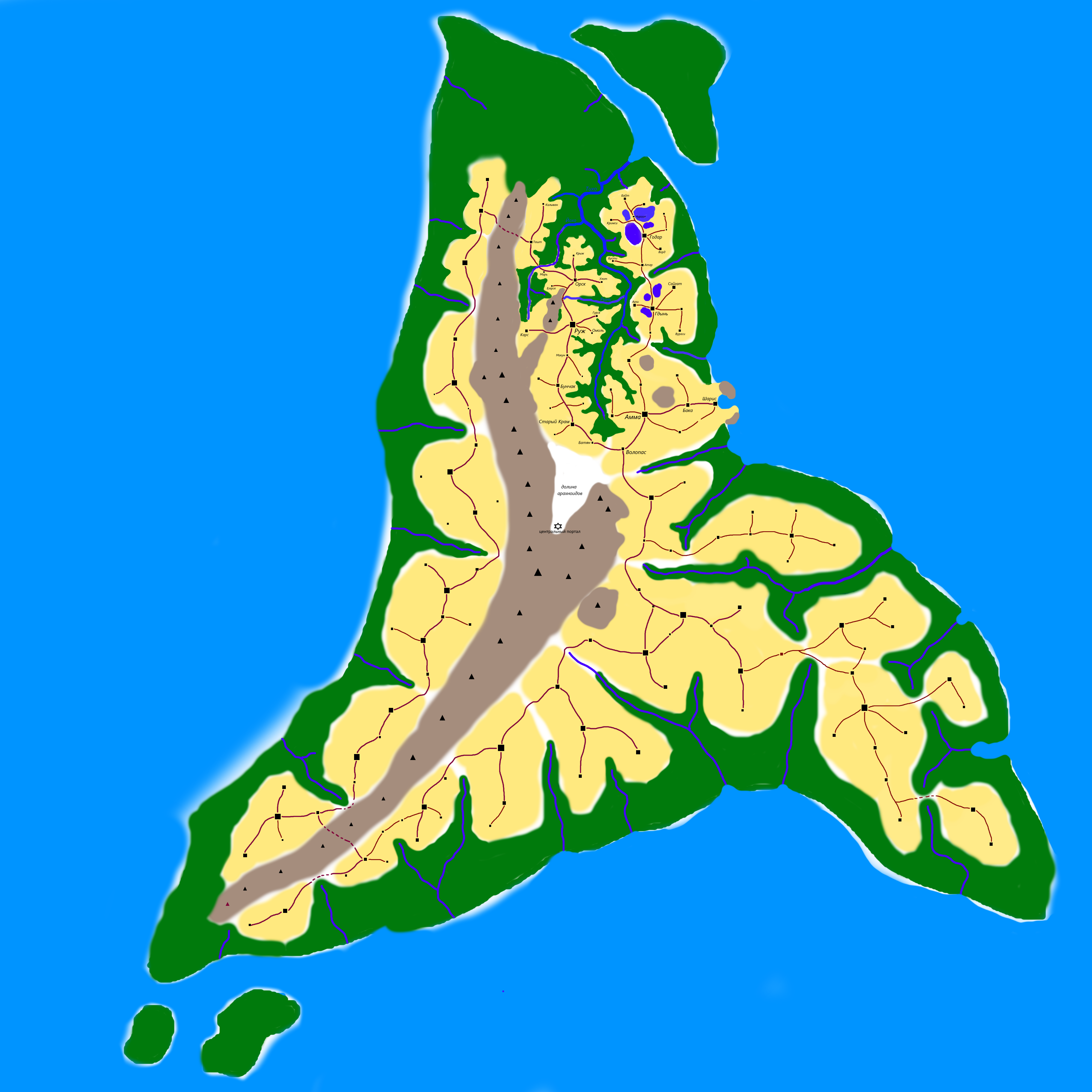 Карта острова Крам, хранящаяся в Стане гвардии в Орске. Очевидно, это не совсем полная копия, сделанная для северных кланов – подписаны только города и реки северной части, относящиеся к кланам Синего Быка, Ленивой Воды и Белой Чайки.